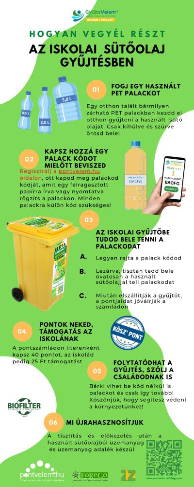 Tartson velünk a környezettudatosság elterjesztésében a fiatalok körében - hiszen nélkülük nincs jövőnk! A PontVelem, a FoReGo Kft. és a Biofilter Zrt. együttműködésével idén elindította a GyűjtsVelem olajgyűjtő programját. Az idei tanévtől az iskolák országszerte csatlakozhatnak a PET palackos használt sütőolaj gyűjtéshez!