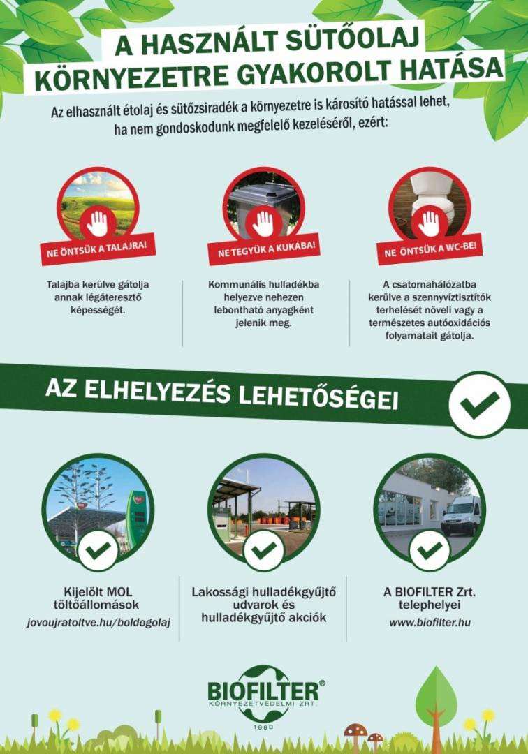 - A leadott használt sütőolajat a Biofilter Zrt. feldolgozza, majd biodízel alapanyagként hasznosítja újra, ezzel mentesítve csatornáinkat a terheltségtől és élő vizeinket a szennyeződéstől.
